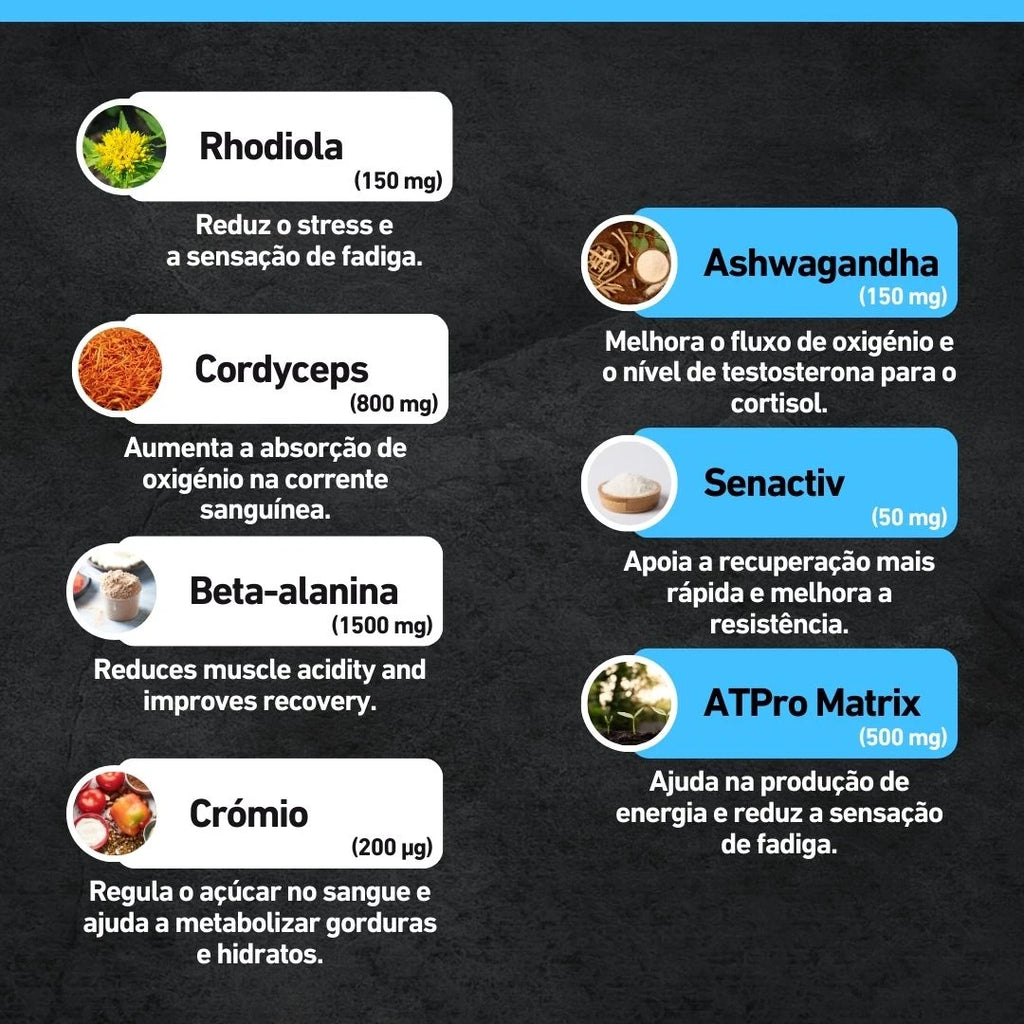 Suplemento alimentar. Ingredientes: beta-alanina, extrato de micélio de cordyceps padronizado para um mínimo de 7% de ácido cordyceps e 10% de polissacarídeos, ATPro Matrix (piruvato de cálcio, sais de sódio de ácido ortofosfórico, ribose), extrato de raiz de ashwagandha (Withania Sominfera), extrato de raiz de rhodiola (Rhodiola Rosea), agente antiaglomerante: sais de magnésio de ácidos gordos, Senactiv (extrato de raiz de Panax notoginseng, extrato de fruto de Roda Roxburghii), picolinato de crómio, cápsula vegan (corante: carbonato de cálcio). Agente de volume: sais de magnésio de ácidos gordos. Quantidade: 84 cápsulas.