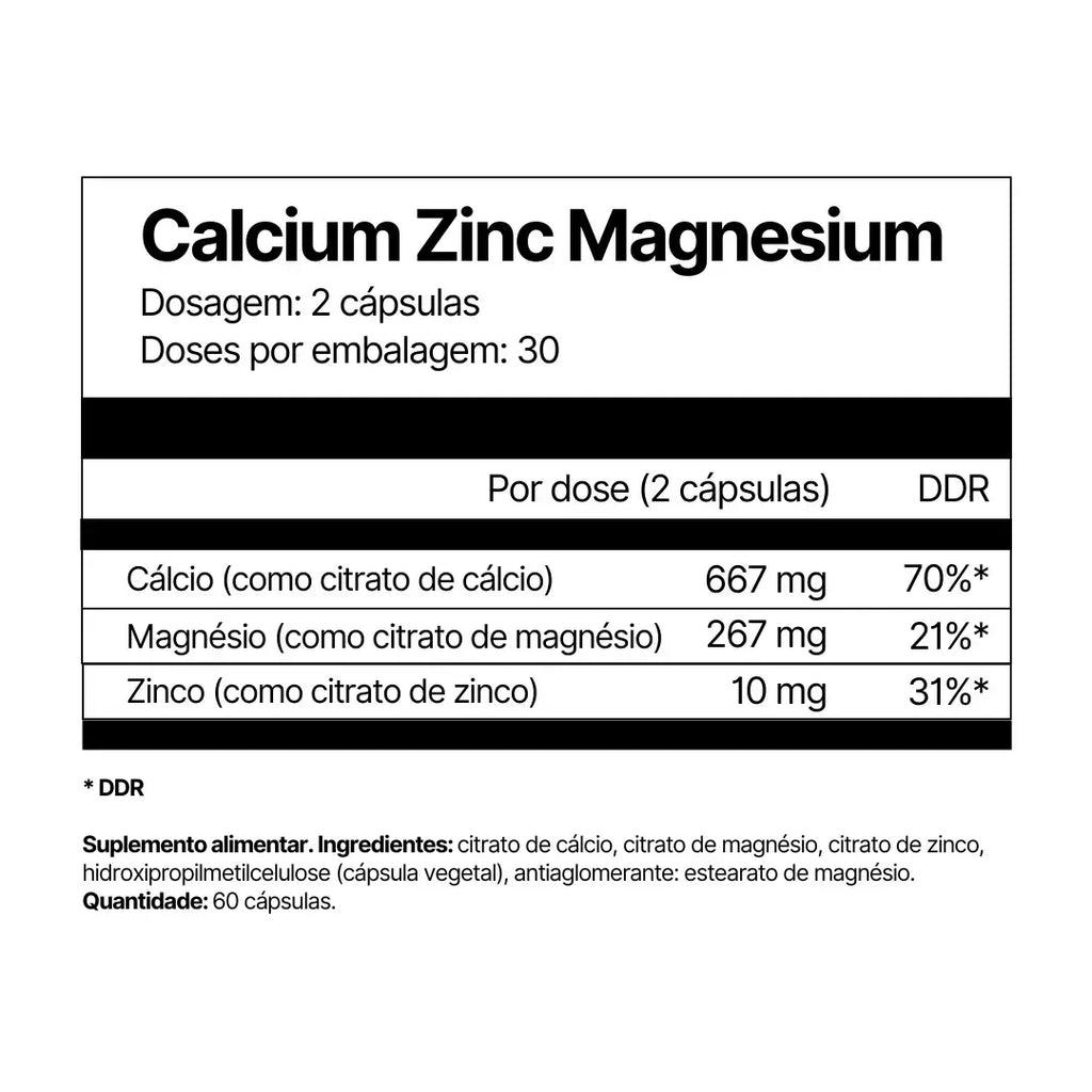 Suplemento alimentar. Ingredientes: citrato de cálcio, citrato de magnésio, citrato de zinco, hidroxipropilmetilcelulose (cápsula vegetal), antiaglomerante: estearato de magnésio. Quantidade: 60 cápsulas.