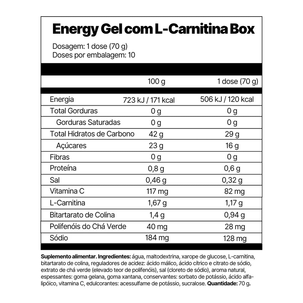 Cada gel contém 1,17 g de L-carnitina, que ajuda o corpo a transformar gordura em energia durante o exercício intenso — onde normalmente a energia seria obtida apenas a partir do glicogénio.