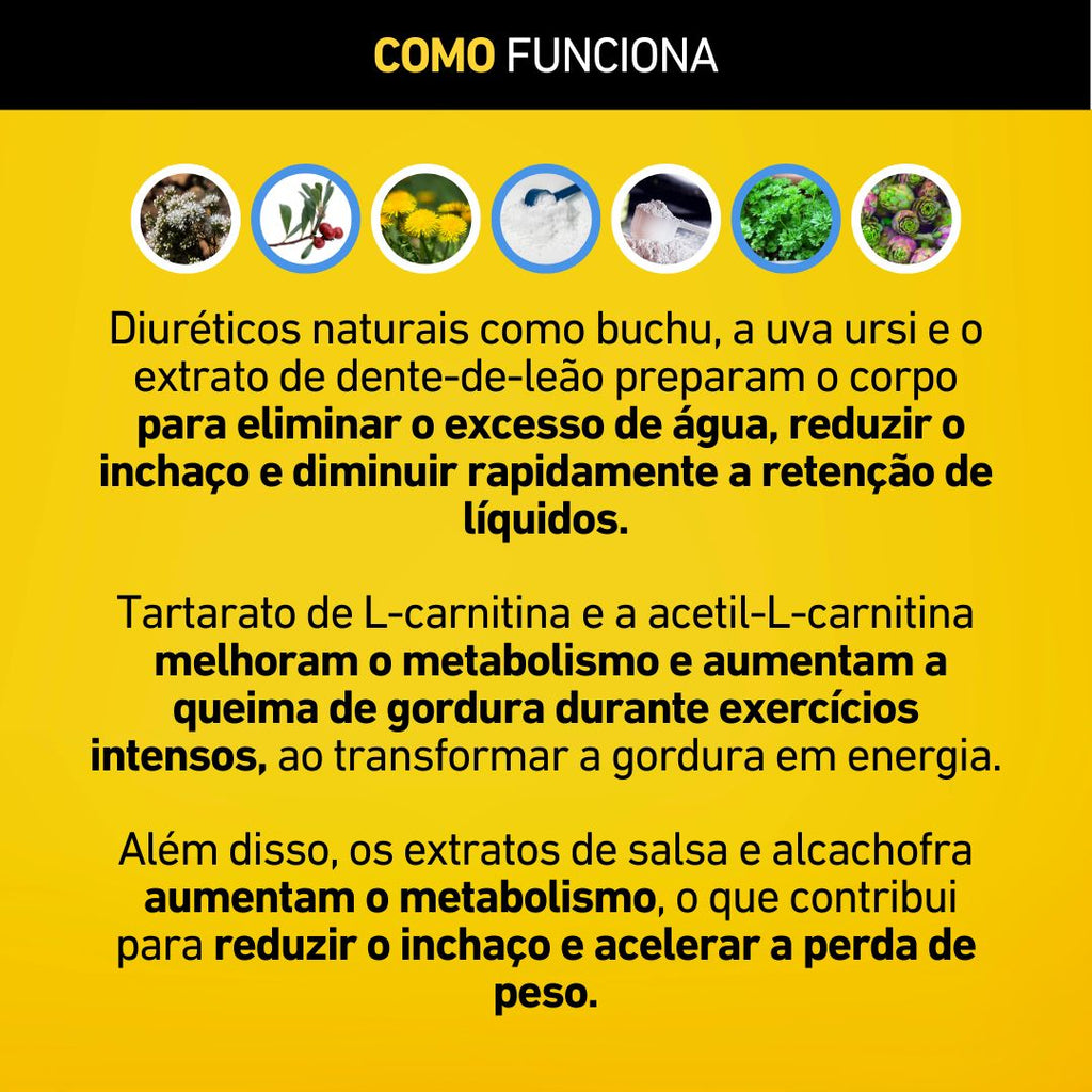 Suplemento alimentar. Ingredientes: Tartarato de L-carnitina, Acetil-L-carnitina HCL, Uva Ursi (20% de arbutina), Extrato de dente-de-leão (Taraxacum officinale) dos quais 5% de taraxol, Extrato de salsa (Petroselinum crispum) 10:1, extrato de folhas de buchu (Agathosma betulina) 10:1, extrato de alcachofra, dos quais 5% cinarina, vitamina B6 (como piridoxina), potássio (como citrato de potássio), cápsula vegana; agente antiaglomerante: estearato de magnésio. Pode conter vestígios de aveia, cevada, trigo (GLÚTEN), peixe, leite (LEITE) e soja (SOJA). Quantidade: 84 cápsulas