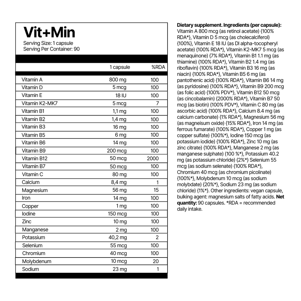 Suplemento alimentar. Ingredientes (por cápsula): Vitamina A 800 mcg (como acetato de retinol) {100% RDA*}, Vitamina D 5 mcg (como colecalciferol {100%}, Vitamina E 18 IU (como acetato de Dl-alfa-tocoferilo) {100% RDA*}, Vitamina K2-MK7 5 mcg (como menaquinona) {7% RDA*}, Vitamina B1 1.1 mg (como tiamina) {100% RDA*}, Vitamina B2 1.4 mg (como riboflavina) {100% RDA*}, Vitamina B3 16 mg (como niacina) {100% RDA*}, Vitamina B5 6 mg (como ácido pantoténico) {100% RDA*}, Vitamina B6 14 mg (como piridosina) {100% RDA*}, Vitamina B9 200 mcg (como ácido fólico) {100% PDV*}, Vitamina B12 50 mcg (como cianocobalamina) {2000% RDA*}, Vitamina B7 50 mcg (como biotina) {100% PDV*}, Vitamina C 80 mg (como ácido ascórbico) {100% RDA*}, Cálcio 8.4 mg (como carbonato de cálcio) {1% RDA*}, Magnésio 56 mg (como óxido de magnésio) {15% RDA*}, Ferro 14 mg (como fumarato ferroso) {100% RDA*}, Cobre 1 mg (como sulfato de cobre) {100%*}, Iodo 150 mcg (como iodeto de potássio) {100% RDA*}, Zinco 10 mg (como citrato de zinco) {100% RDA*}, Manganês 2 mg (como sulfato de manganês) {100 %*}, Potássio 40.2 mg (como cloreto de potássio) {2%*} Selénio 55 mcg (como selenato de sódio) {100% RDA*}, Crómio 40 mcg (como picolinato de crómio) {100%*}, Molibdénio 10 mcg (como molibdato de sódio) {20%*}, Sódio 23 mg (como cloreto de sódio) {1%*}. Outros ingredientes: cápsula vegan, antiaglomerante: sais de magnésio de ácidos gordos. Quantidade: 90 cápsulas. *DDR= dose diária recomendada.