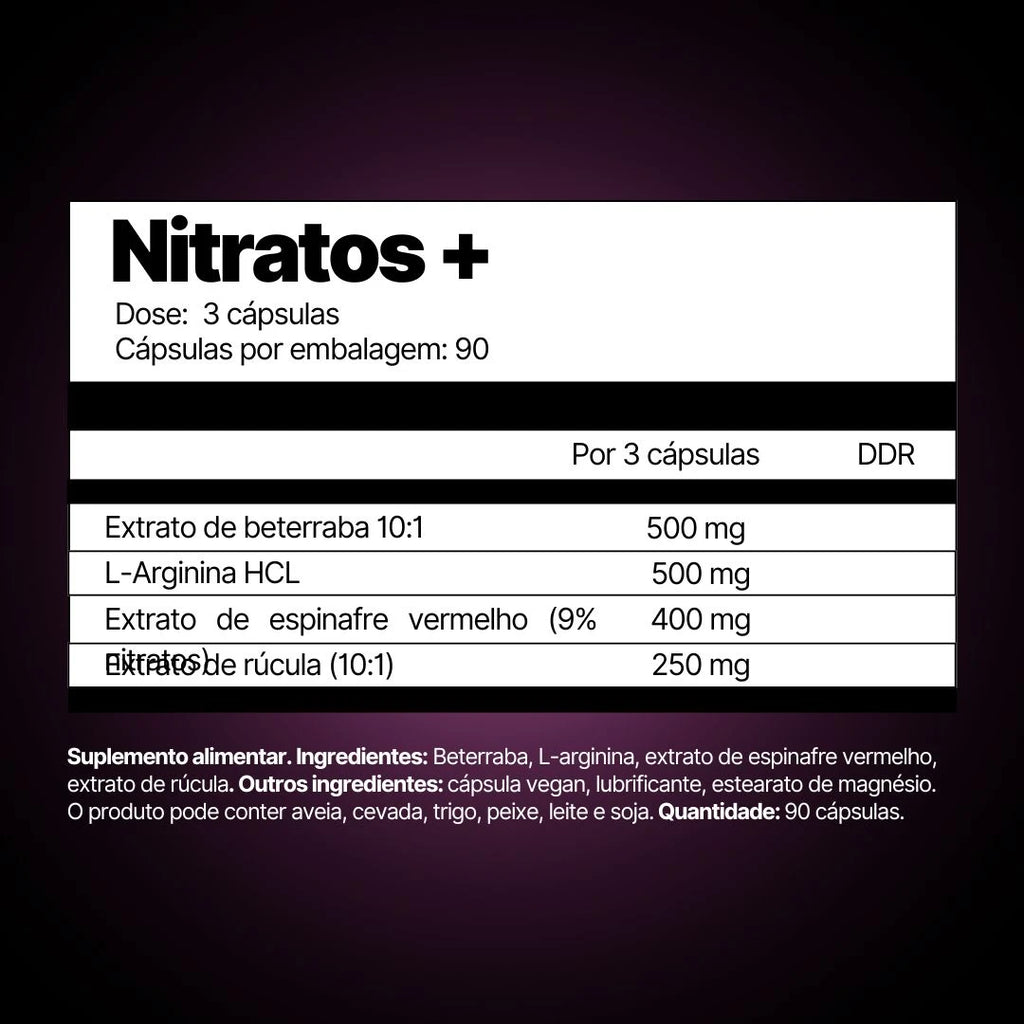 Nitrates+ é composto por 3 fontes naturais de nitratos e Arginina HCL que melhoram o fluxo sanguíneo, aumentam a utilização de oxigénio (aumentando indiretamente o VO2 máximo) e retardam a fadiga durante exercícios intensos.