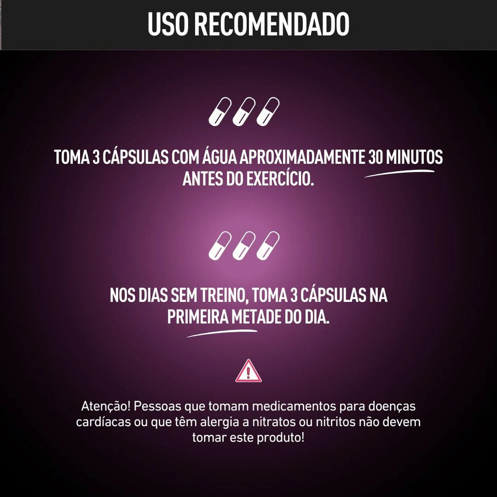 Suplemento alimentar. Ingredientes: Beterraba, L-arginina, extrato de espinafre vermelho, extrato de rúcula. Outros ingredientes: cápsula vegan, lubrificante, estearato de magnésio. O produto pode conter aveia, cevada, trigo, peixe, leite e soja. Quantidade: 90 cápsulas.