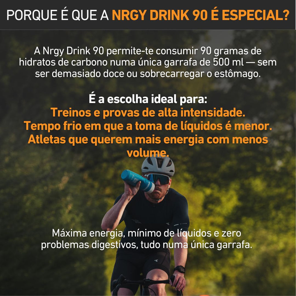 A Nrgy Drink 90 é uma bebida desportiva adaptada a uma maior ingestão de energia. Embora ofereça a mesma quantidade de HC por colher (22,5 g) que a Nrgy Drink 45, a quantidade de eletrólitos e a intensidade do sabor são adaptadas à maior quantidade numa única garrafa.