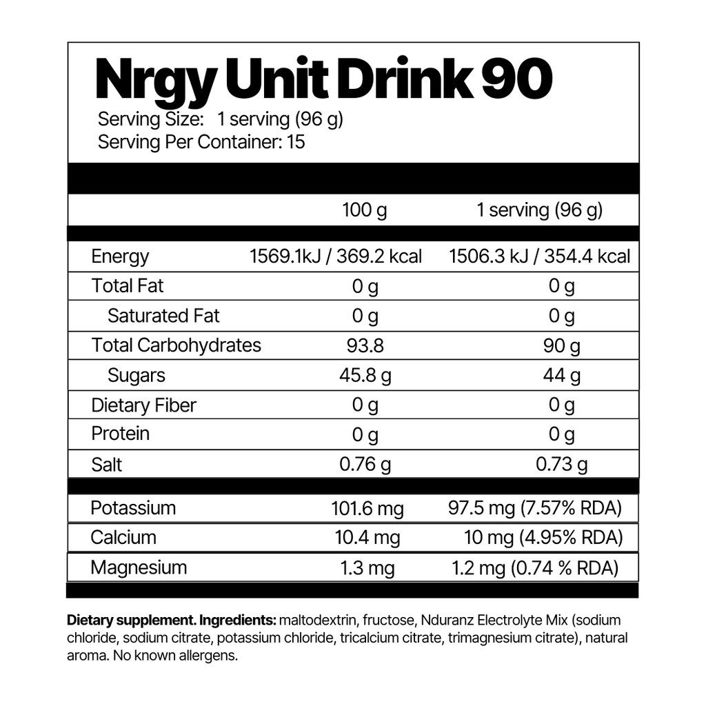A Nrgy Unit Drink 90 foi desenvolvida para atletas de elite que necessitam de ingerir 90 gramas de hidratos de carbono por hora, sem a necessidade de beber grandes quantidades de água.