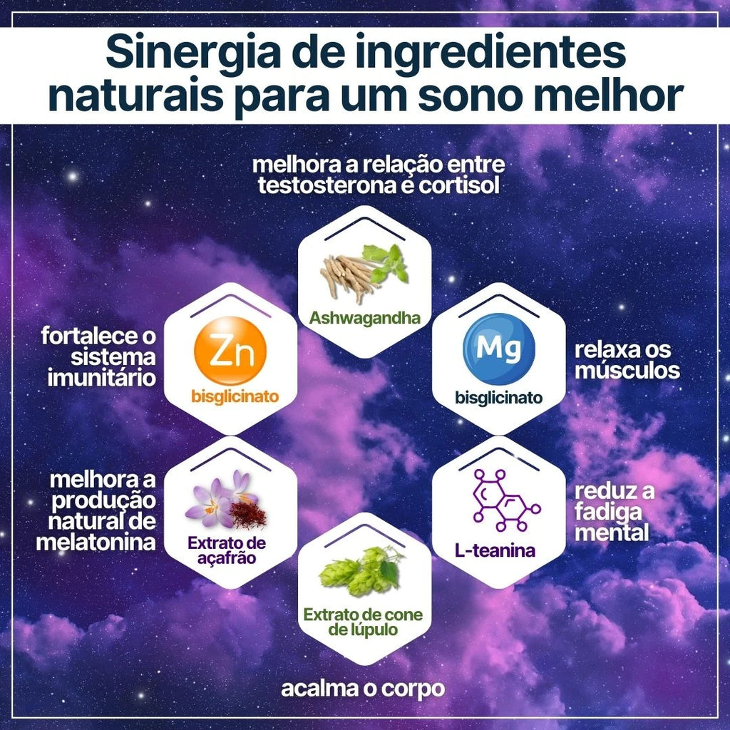 Suplemento alimentar. Ingredientes: extrato de raiz de ashwagandha (Withania somnifera) normalizado para 7% de withanolides, bisglicinato de magnésio, L-teanina, extrato de cone de lúpulo (Humulus lupulus), maltodextrina, extrato de açafrão (Crocus sativus), agentes antiaglomerantes: sais de magnésio de ácidos gordos e dióxido de silício, bisglicinato de zinco, cápsula (invólucro: hidroxipropilmetilcelulose, carragenina, corante: carbonato de cálcio, amido modificado, regulador de acidez: acetato de potássio). Pode conter vestígios de frutos de casca rija, glúten, soja e leite. Quantidade: 60 cápsulas. ATENÇÃO: Não utilize o produto se sofrer de diabetes!
